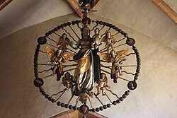 Die Rosenkranzmadonna vor dem Triumphbogen wurde im 17. Jahrhundert von Hans Finkhl geschnitzt und 1655/56 von Piero Asuardo gefasst. Im Langhaus sind in den Zwickeln des östlichen Doppeljochs acht Dreipässe mit Heiligenbüsten und dazwischen ganzfigurig die heiligen Wolfgang und Andreas gemalt.[13][14]