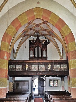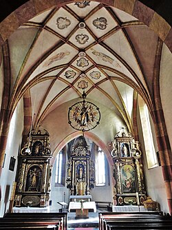Das Netzrippengewölbe (Sternrippengewölbe) über gekehlten Wandpfeilern mit Rundvorlage im Langhaus wird durch einen herabgezogenen abgefasten Spitzbogen in zwei Doppeljoche geteilt. Im westlichen Joch steht die barocke Holzempore mit einer neugotischen Orgel. Ein eingezogener, spitzbogig abgefaster Triumphbogen verbindet das Langhaus mit dem einjochigen Chor. Die östlich an die Triumphbogenwand anschließenden älteren Mauerteile stammen von einer halbkreisförmigen romanischen Apsis. Im Chor erhebt sich ein Kreuzrippengewölbe über halbrunden Wandvorlagen, die im unteren Drittel der Wand in fratzenhafte Kopfkonsolen enden. Die insgesamt acht Köpfe schmücken die Dreiviertelsäulen in Höhe der Fensterbänke. Die Kopfdekore sind symbolische Darstellungen von Dämonen, die in den Dienst der Kirche gezwungen worden sind.[5] In der Chornordwand befindet sich eine Sakramentsnische mit ursprünglichem Gitter, die von einem Kielbogen mit Kreuzblume sowie seitlichen Fialen bekrönt wird.[5]