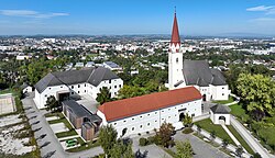 | Luftaufnahme des Pfarrhofes und der röm.-kath. Pfarrkirche der oberösterreichischen Marktgemeinde Thalheim bei Wels und im Hintergrund die Stadtgemeinde Wels. Links der dreiflügelige Pfarrhof aus dem dritten Viertel des 17. Jahrhunderts. Davor der ehemalige langgestreckte Wirtschaftstrakt und rechts die spätgotische Pfarrkirche hl. Stephanus. | Eigenes Werk | C.Stadler/Bwag | Datei:Thalheim bei Wels - Kirche mit Pfarrhof.JPG |