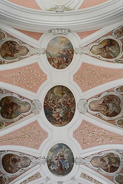 | Die Fresken an der Decke der Pfarrkirche von Viechtwang wurden 1725 von Wolfgang Andreas Heindl geschaffen. Die Medaillons in der Mitte zeigen die Speisung der Fünftausend, Das Abendmahl und Christus als Guten Hirten. An den Seiten werden Evangelisten und Kirchenväter dargestellt. | Eigenes Werk | Isiwal | Datei:Scharnstein Viechtwang Pfarrkirche Chor Fresken.jpg | |