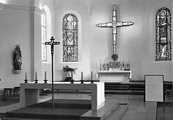 Pfarrer Bruno Regner wollte 1961 den durch das Zweite Vatikanische Konzil hervorgerufenen neuen Grundsätzen der Orientierung eines Altarraumes und der neuen Zeremonieart – nicht mehr zum Altar, sondern zum Volk zelebrierend – als einer der ersten Pfarrer nachkommen. Er leitete eine tiefgreifende Umgestaltung der Kirche ein. Dabei wurden sämtliche Stuckaturen, kunstvoll ausgeführten Fresken und Deckenbemalungen abgeschlagen oder überputzt. Der wertvolle Hochaltar (1906 errichtet und als „wahres Meisterwerk im barocken Stil“ bezeichnet), die Statuen und Bilder wichen kahlen Wänden. Zwei Fenster im Querschiff wurden zugemauert sowie zwei Emporen und die Kanzel entfernt. Der Altarraum wurde unter dem Vierungsgewölbe im Zentrum der Kirche eingerichtet. Diese radikale Umorientierung und Konzentrierung auf das Wesentliche fand nicht bei der ganzen Pfarrgemeinde Anerkennung. Es gab begeisterte Zustimmung und schroffe Ablehnung. Künstlerisches Handwerk einiger Generationen wurde durch diesen Schritt zerstört. Neue künstlerische Arbeiten beschränkten sich nur auf die Kreuzwegstationen, einen Leuchtkreuz statt des Hochaltares und zwei große Tafelbilder.