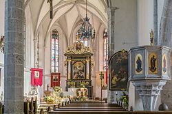 Eine Kirche an diesem Ort wird 1179 erstmals urkundlich erwähnt. Der Bau der heutigen Pfarrkirche im spätgotischen Stil wurde um 1484 begonnen und um 1527 teilweise fertiggestellt. 1575 wurde eine Sakristei angebaut. Der Turm wurde 1629 vollendet. Dieser massive Glockenturm hatte ursprünglich einen steinernen Helm mit vier zierlichen Nebentürmen, erhielt jedoch im Jahr 1807 einen Zwiebelhelm.[2] 1899 wurde der Kirchturm neugotisch gestaltet und erhielt Dreiecksgiebel, welche die Zifferblätter beherbergen, sowie ein achteckiges pyramidenförmiges Steildach mit 52 m Gesamthöhe. 1916 erfolgte die Abnahme der fünf bronzenen Kirchenglocken und des kupfernen Turmdaches. Eine provisorische Deckung mit Teerpappe bestand bis 1920, bis 1953 war das Turmdach mit Holzschindeln gedeckt.