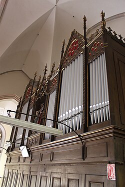 Die Orgel auf der Empore wurde im Jahr 1882 als Objekt für eine Musik- und Theaterausstellung in Wien in der Werkstatt von Josef und Hans Mauracher aus St. Florian hergestellt. Den Prospekt entwarf Heinrich Hollitzky, ein Schüler des Dombaumeisters Friedrich von Schmidt. Im Jahr 1892 kam das Instrument in die Pfarrkirche nach Weinhaus und wurde hier am 15. November geweiht. Im Jahr 1899 kam in die Mitte des Prospekts eine Figurengruppe: eine Statue der hl. Cäcilia wird von zwei Engeln flankiert.[5] 1968 nahm der Orgelbauer Philipp Eppel einen Umbau des Prospekts im neobarocken Stil vor und rüstete sie auf elektropneumatische Traktur um. Orgelbauer Franz Windtner aus St. Florian führte ab 1998 im Auftrag der Kirchengemeinde eine Generalsanierung durch.[20] Zur Finanzierung verkaufte die Gemeinde Orgelpatenschaften: Je nach Größe einer Orgelpfeife konnten für 50, 100 oder 200 Euro Patenschaften ausgestellt werden; die entsprechende Pfeife wurde mit dem Namen des Paten versehen.[21] Und im Jahr 2023 konnte die wiederum notwendige Restaurierung durch die Bonner Orgelbauwerkstatt 2023 Philipp C.A. Klais erfolgen.[22]