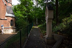 Hinter der Pfarrkirche, in einem Garten bergseitig zur Türkenschanze hinauf, standen ursprünglich fünfzehn vom Bildhauer Rochus Haas geschaffene Bildstöcke für den Rosenkranzweg.[23] Er wurde im Jahr 1883 auf dem Abhang zwischen der damals im Bau befindlichen Pfarrkirche und der Türkenschanze angelegt.[24] Die aus Kalkstein geschlagenen Bildstöcke wurden 1892 aufgestellt und bestehen aus jeweils einer Säule, die nach oben verbreitert ist und ein Halbrelief enthält, das die Geheimnisse des freudenreichen, des schmerzhaften und des glorreichen Rosenkranzes darstellt. Zehn der Bildstöcke erhielten einen neuen Platz an der Kirchenmauer, die nun auf gegossenen Betonfundamenten stehen. Zum Erhalt der Bildstöcke und des Weges ist die Gemeinde auf Spenden angewiesen.[25]