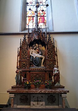 Der 1889 gefertigte Hochaltar ist dem heiligen Josef gewidmet, weswegen Josef größer dargestellt ist als die anderen Figuren.[6]