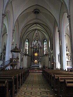 | Innenansicht Richtung Hochaltar der römisch-katholischen Weinhauser Pfarrkirche im 18. Wiener Gemeindebezirk Währing . Die Kirche wurde nach Plänen des Wiener Dombaumeisters Friedrich von Schmidt unter Baumeister Johann Schmalzhofer von 1883 bis 1893 errichtet. | Eigenes Werk | C.Stadler/Bwag | Datei:Währing (Wien) - Weinhauser Pfarrkirche, innen.JPG |