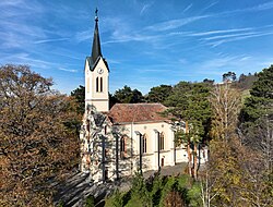 Die Kirche befindet sich auf einer Anhöhe im Osten des Ortes.[2]