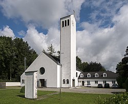 Die Kirche ist ein nüchterner Bau mit Satteldach.