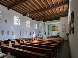 Die Kirche ist ein großer rechteckiger Saalraum mit anschließendem rechteckigem und eingezogenem Chorraum mit geradem Abschluss. Das Gotteshaus ist 30 m lang und 13 m breit. Der Chor ist erhöht. Über Chor und Langhaus ist eine Flachdecke. Der Kirchturm ist 26 m hoch.