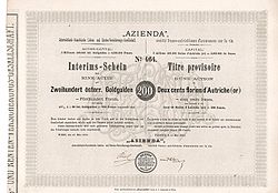 | Interimsschein einer Aktie der Azienda vom 13. Mai 1882 | http://www.gutowski.de/Katalog-56/Katalogbilder/1163.jpg | Unbekannte Autoren und Grafiker; Scan von Auktionshaus Vladimir Gutowski | Datei:Azienda 200 GG 1882.jpg | |