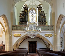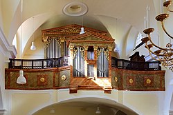 | Blick Richtung Orgelempore in der röm.-kath. Pfarrkirche hl. Valentin der niederösterreichischen Marktgemeinde Großrußbach . Das Orgelgehäuse von Johann Hencke (1743) ist ein zweiteilig gestaffeltes Prospekt mit den Aufsatzfiguren Cäcilia und David und hat ein gleichzeitiges Brüstungspositiv. Das Orgelwerk ist von Philipp Eppel (1961). | Eigenes Werk | C.Stadler/Bwag | Datei:Großrußbach - Kirche, Orgelempore.JPG | |