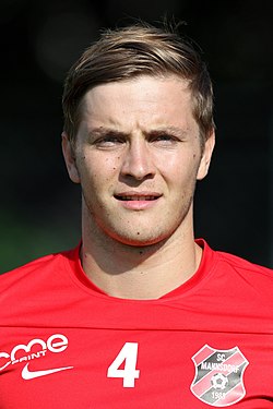 | Friendly match SC Mannsdorf (red shirts) vs. SC Wiener Neustadt (blue shirts) 0-2 in Katzelsdorf on 2016-07-01. – The photo showsPhilipp Gallhuber (SC Mannsdorf). | Eigenes Werk | Steindy ( Diskussion ) 21:16, 19 July 2016 (UTC) | Datei:SC Mannsdorf vs. SC Wiener Neustadt 2016-07-01 -012-.jpg |