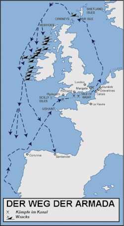Zwar war die spanische Flotte auch in der Folgezeit noch durchaus schlagkräftig, wie sich 1589 bei der Abwehr des Gegenangriffs durch die Englische Armada zeigen sollte,[40] jedoch markierte die Niederlage den Beginn der Stagnation Spaniens. England hatte dem Weltreich erfolgreich getrotzt und so die Notwendigkeit aufgezeigt, ein gewaltiges Kolonialreich mit einer entsprechenden Flotte zu schützen. Als Reaktion auf das Ergebnis der Seeschlacht begann Philipp erst nach 1588 verstärkt, systematisch eine hochseetaugliche Flotte für den Einsatz im Atlantik aufzubauen. Die englisch-spanische Auseinandersetzung endete erst 1604.