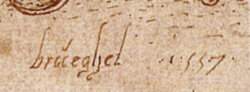 | Signatur und Datierung auf dem Kupferstich Die sieben Laster, Ira von Pieter Bruegel dem Älteren .(Gabinetto dei Disegni e delle Stampe, Florenz) | Christian Vöhringer – Pieter Bruegel 1525/30-1569 Tandem Verlag GmbH h.f.ullmann (Imprint) 2007 S. 41 ISBN 978-3-8331-3852-2 | Pieter Bruegel der Ältere | Datei:Die sieben Laster, Ira (Signatur).png | |