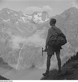Originale Bildbeschreibung von der Deutschen Fotothek Wanderer im Karwendel | Deutsche Fotothek | Richard Peter | Datei:Fotothek df ps 0001913 Landschaften ^ Hügellandschaften - Gebirgslandschaften ^.jpg | |