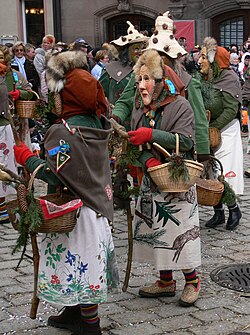 | Plätzlerzunft Weingarten, Figur: Waldweible Veranstaltung: Narrensprung beim Narrentreffen Meßkirch 2006 | Selbst fotografiert | Photo: Andreas Praefcke | Datei:Plätzlerzunft Weingarten Waldweible Narrentreffen Meßkirch 2006.jpg | |