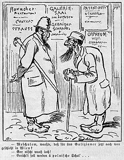 | Karikatur aus Anlass der geplanten Errichtung der Polnischen Schul. | Figaro , 20. Oktober 1883, S. 7. | Hans Schließmann (1852–1920) | Datei:Polnische-Schul-Wien-(1883).jpg | |