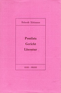 | Cover des Buches: Helmuth Schönauer: Pontlatz. Gericht. Literatur. Hand-Presse, Innsbruck 1988. ISBN 3-900862-07-9 . | Helmuth Schönauer | Helmuth Schönauer | Datei:Pontlatz.Gericht.Literatur.jpg |