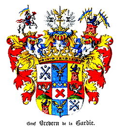 | Coat of arms of Brevern de la Gardie family. | Baltisches Wappenbuch. Wappen sämmtlicher, den Ritterschaften von Livland, Estland, Kurland und Oesel zugehöriger Adelsgeschlechter | Carl Arvid von Klingspor | Datei:GrafBrevernDeLaGardieWappen.jpg | |
