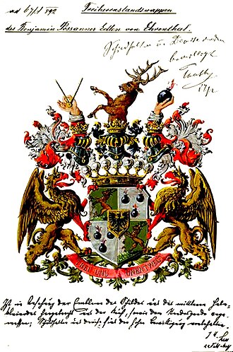 | Wappen der Possanner von Ehrenthal (Freiherrenstand, 1892) | Österreichisches Staatsarchiv, AT-OeStA/AVA Adel HAA AR 743.19 Possaner (Possanner) von Ehrenthal, Benjamin, k.k. Sektionschef in Pension, Freiherrenstand, 1892.02.17 . | Unbekannt (1892) | Datei:AT-OeStA AVA Adel HAA AR 743.19.jpg | |