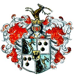 Das freiherrliche Wappen (1892) ist geviert mit goldenem Herzschild belegt, darin ein gekrönter schwarzer Adler, die aufgerichteten Spitzen eines halb geöffneten goldenen Zirkels erfassend; 1 und 4 in Grün ein eine steile graue Felswand anspringender natürlicher Hirsch, 2 und 3 in Silber 3 (2, 1) brennende Granaten. Freiherrenkrone und drei gekrönte Helme; auf dem rechten und linken mit rot-silbernen Decken je eine aus rotem Ärmel mit weißem Umschlag auswärts gekrümmte Rechthand, rechts einen goldenen Zirkel am Schenkel fassend, links eine brennende Granate haltend; auf dem mittleren mit schwarz-goldenen Decken ein wachsender natürlicher Hirsch.