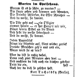 | Warten im Speisehaus, in: Prager Tagblatt, 4. April 1912, Jahrgang 37, Nummer 93, Seite 6 | ANNO | Kurt Tucholsky | Datei:Warten im Speisehaus-Prager Tagblatt-1912.png |
