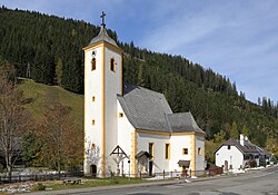 | Südansicht der röm.-kath. Pfarrkirche hl. Josef in Turrach, ein Dorf in der steiermärkischen Gemeinde Stadl-Predlitz. Die Kirche wurde 1726 von Fürst Adam von Schwarzenberg für seine Knappen gestiftet und auf den Heiligen der Arbeiter geweiht. Im gleichen Jahr wurde in Turrach auch ein Vikariat eingerichtet und 1863 erfolgte die Erhebung zur eigenständigen Pfarre. | Eigenes Werk | C.Stadler/Bwag | Datei:Turrach - Kirche.JPG | |