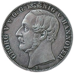 | Taler des Königreichs von 1865 mit dem Porträt von Georg V., der Künstlersignatur „ BREHMER F. “ am Halsabschnitt und dem Buchstaben B für den Münzmeister Theodor Wilhelm Brüel . | Münze eigene Sammlung / eigenes Bild | DJM ( talk ) 18:30, 8 October 2009 (UTC) | Datei:1865 Georg V Hannover.JPG | |
