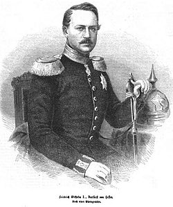Der Kurfürst befürchtete 1866 einen Aufstand im Inneren mehr als die Preußen und hätte lieber abseits gestanden, während Österreich Preußen besiegen würde. Mit seinen Truppen wollte er, selbst bei Mobilmachung des Bundesheeres, nur sein eigenes Land verteidigen. Er rief empört erst zum Kampf auf, als Bismarck am 15. Juni ihn für ein Bündnis gewinnen wollte: Im Falle eines preußischen Sieges bekäme Hessen-Kassel Gebiete von Hessen-Darmstadt. Der Landtag hingegen wollte, dass Hessen-Kassel neutral blieb. Sogar der Kriegsminister bat um Entlassung, die ihm allerdings ausgeredet wurde. Preußische Truppen marschierten am 19. Juni ohne einen Schuss in Kassel ein, bei einer grundsätzlich freundlich gesinnten Bevölkerung. Der Kurfürst hatte sich zu fliehen geweigert und wurde, als einziger Landesherr, von Preußen gefangen genommen. Seine Armee war nur an einer einzigen Schlacht beteiligt und hatte vier Gefallene zu beklagen.[46] Der Befehlshaber des preußischen 1. Armeecorps, Karl von Werder, und der Kölner Regierungspräsident Eduard von Möller übernahmen die Statthalterschaft in Kurhessen.[47]