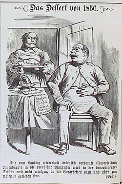 Ein Ausschuss des Landtags hielt derartige Volksabstimmungen für mehr Schein als Wesen. (Es gab sie, als Napoleon III. 1859 Nizza und Savoyen von Sardinien-Piemont erwarb.) Laut einer Rede Bismarcks im Ausschuss waren die Annexionen die nötige Basis dafür, dass Preußen der deutschen Nation dienen konnte. Er konnte sicher sein, dass eine solche Auffassung in weiten Kreisen des Bürgertums geteilt wurde, auch in den besetzten Gebieten. Die Landtagsabgeordneten sahen ebenfalls das „Recht der Eroberung“, solange es der staatlichen Einheit der Nation förderlich war.[21]