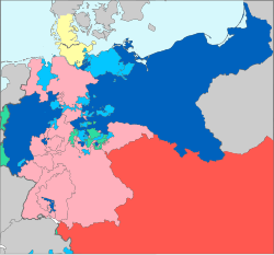 Preußen besetzte im Juni und Juli 1866 während des Kriegszuges Holstein, Sachsen, Hannover, Hessen-Kassel, Nassau, Frankfurt und die großherzoglich-hessische Provinz Oberhessen. Nach Ende der Kampfhandlungen besetzte Preußen Reuß älterer Linie und Sachsen-Meiningen. Bis auf das österreichisch verwaltete Holstein waren diese Staaten allesamt österreichische Verbündete in Norddeutschland.[36]