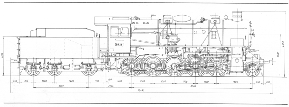 | Schnittzeichnung mit Maßen der Dampflokomotive Badische G 12 der Deutschen Reichsbahn. Die Mappe "Lokomotiven" hat keine ISBN und wurde von der DEWAG Halle erstellt und von der Deutschen Reichsbahn auf Eisenbahnveranstaltungen vermarktet. | Bilder von der Eisenbahn; Mappe "Lokomotiven", DEWAG Halle, Druckgenehmigung der DDR: Ag 736/112/88 | DEWAG, Zeichnung erstellt von W. Dietmann, Scan erstellt von mir | Datei:Schnittzeichnung-BR58.png | |