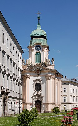 Raymund Ferdinand von Rabatta, Bischof von Passau, erteilte 1718 die Bewilligung zur Errichtung einer Hauskapelle. Die Pläne hierfür entwarf Johann Lucas von Hildebrandt, zur Ausführung kamen sie unter Stadtbaumeister Prunner.[1] Die Marmorarbeiten und der Dachstuhl wurden vom Salzburger Hofbauamt gefertigt. Nach der Grundsteinlegung am 18. Mai 1718 erreichte der Rohbau noch im selben Jahr die Traufenhöhe. 1719 erfolgte die Errichtung des Dachstuhls und des Hauptportals, 1720 wurden die Gewölbe eingezogen. Die Innengestaltung wurde 1721 begonnen, die Turmkreuzsteckung erfolgte am 25. Juli 1721. Nach der Fertigstellung der Innenraumgestaltung wurde die Kirche 3. Juni 1725 vom Passauer Bischof Joseph Dominikus von Lamberg geweiht.