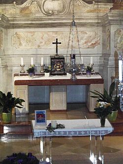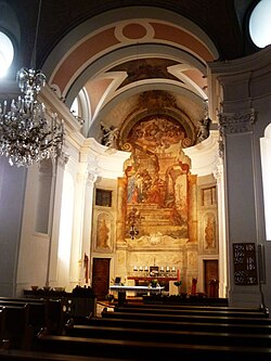 Das Deckenfresko zeigt unter anderem eine Scheinarchitektur mit Armen und Kranken, die ihre Hände nach einem von einem Engel getragenen Füllhorn, aus dem sich ein Münzstrom ergießt, ausstrecken. Das Hauptmotiv des Deckenfreskos ist die himmlische Dreifaltigkeit mit dem Auferstandenen.[17] Der linke Seitenaltar zeigt die Enthauptung des Jakobus des Älteren, der rechte die Verbrennung des Märtyrers Laurentius.