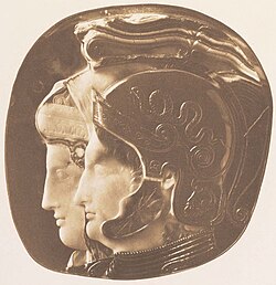 | Ptolemäer-Kameo, 115 x 113 mm, ca. 278 v. Chr., abgebildet sind Ptolemaios II. und seine Schwester und Gemahlin Arsinoë II (Datierung und Identifizierungen sind weiterhin Gegenstand wissenschaftlicher Debatte). Der Stein war am Dreikönigenschrein im Kölner Dom angebracht und wurde 1574 geraubt. Anschließend gelangte er über mehrere Besitzer in das Kunsthistorische Museum in Wien. | Adolf Furtwängler: Die antiken Gemmen. Geschichte der Steinschneidekunst im klassischen Altertum . First volume, plate LIII (partim), Leipzig and Berlin: Giesecke & Devrient 1900. At the Internet Archive: https://archive.org/details/DieAntikenGemmenGeschichteDerSteinschneidekunstImKlassischen/page/n7 | Anonymous photographer. | Datei:Ptolemy cameo, Vienna, bw photograph, ca. 1900.jpg | |