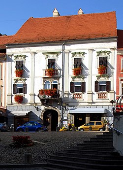 - Im Kern des Ortes sind Bauwerke aus der Entwicklungszeit erhalten und denkmalgeschützt. Dazu gehören das Alte Rathaus (siehe Bild), das neue Rathaus (ein ehemaliges Bürgerpalais aus dem Jahr 1906), weiter Bürgerpaläste, das Schloss (die Burg) auf der Spitze des Berges. Letzteres ist von mehreren Baustilen geprägt, unter anderem sind venezianische Einflüsse erkennbar.