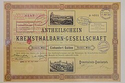 | Anteilschein im Wert von 100 österreichischen Gulden an der Kremsthalbahn-Gesellschaft. Der Anteilschein ist im Schlossmuseum in Linz an der Donau ausgestellt. | Eigenes Werk | Isiwal | Datei:Antheilschein der Kremsthalbahn-Gesellschaft-4090.jpg | |
