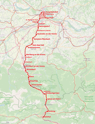 Südwärts wird dann nach Linz Wegscheid die Traun überbrückt und weiter südwärts meist der östlichen Talhangfuss des Kremstales bis zur kaum merklichen Wasserscheide zum Steyrtal hin bei Schön (Micheldorf) über Kremsmünster sowie Kirchdorf an der Krems genutzt. Im Hungerbichltunnel wird der gleichnamige Bergsporn durchbohrt, um den heutigen Bahnhof Klaus an der Pyhrnbahn zu erreichen, der etwas höher als der ehemalige Endpunkt der Kremstalbahn liegt. Von hier ab wird hauptsächlich die westliche (linke) Talflanke über dem Talboden noch tiefer eingeschnittenen Steyr genutzt, dabei die aus dem Toten Gebirge herabfließende Steyrling beim gleichnamigen Bahnhof überbrückt und anschließend kurz an den östlichen Talhang (unter Kreuzung der Steyr) gewechselt. Hoch über der Teichlmündung in die Steyr liegt auf einer Terrasse der Bahnhof Hinterstoder, der nun nach Überfahrung der Teichl erreicht wird. Nun geht es einige Kilometer vergleichsweise geradlinig am flachen Talboden westlich der wieder tiefer eingekerbten Teichl bis etwa Stummergut kurz vor dem ehemaligen Bahnhof Pießling-Vorderstoder, wo aufgrund der ruhigeren Topographie wieder an der östliche Talflanke trassiert wurde. Bei Roßleithen dann tritt die Streckenführung in das Becken von Windischgarsten entlang des Dambachs ein, das an seinem Südsaum ausgefahren und über den Schacherbauertunnel Richtung Edelbachttal und Spital am Phyrn wieder verlassen wird. Nach Überwindung einer sanften Talwasserscheide bei Spital wird wieder der Oberlauf der Teichl erreicht und an der östlichen Talflanke zum Nordportal des Bosrucktunnels angestiegen.