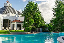 | Im Bild sieht man den Wellnessbereich des Eventhotel Pyramide-im Hintergrund die dazugehörige Pyramide Vösendorf | Eigenes Werk | Christian Kühnelt | Datei:Pyramide Vösendorf und Wellness Outdoor Landschaft.jpg |