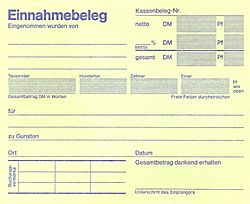 | Buchführung, Einnahmebeleg, Mitte der 1980er Jahre über DM und Pfennige, DIN A5, ca. Abmessung ca. 130x105 mm | Eigenes Werk | Richard Huber | Datei:Einnahmebeleg.jpg | |