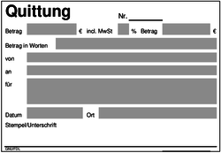 Quittungen für Zahlungen werden u. a. auf einem Quittungsblock, einem Buch mit heraustrennbaren Quittungsvordrucken, angefertigt. Erforderlich ist dies jedoch nicht.