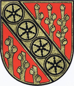 - „Im schwarz und golden gerandeten roten Schild ein goldener, schwarz bordierter Schrägrechtsbalken, belegt mit vier allseits anstoßenden schwarzen sechsspeichigen Wagenrädern; aus dem Schildrand und dem Balken nach oben wachsend je drei goldene Reiser.“