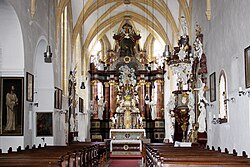 Die Kirche bildet als lang gestreckter Bau die Nordseite des Klosters und ist durch eine überdachte Treppe auf den Klosterhügel erreichbar. Der hohe, schlanke, lange spätgotische Baukörper über sechs Joche schließt mit einem Chor in Langhausbreite ab. Unter einem einheitlichen Dach zeigt die Fassade hohe Spitzbogenfenster, Strebepfeiler und Wasserschläge. Nordseitig mittig im 3. und 4. Joch befinden sich über große Rundbogenöffnungen erreichbar zwei angebaute Seitenkapellen. Die Turmfassade entstand um 1750 im Zuge einer Erweiterung und Barockisierung.
