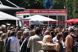 | Das "Glasstudio" von Radio Vorarlberg im Einsatz bei der Eröffnung der Bregenzer Festspiele 2016. | Eigenes Werk | Dodado2 | Datei:Glasstudio RV.jpg | |