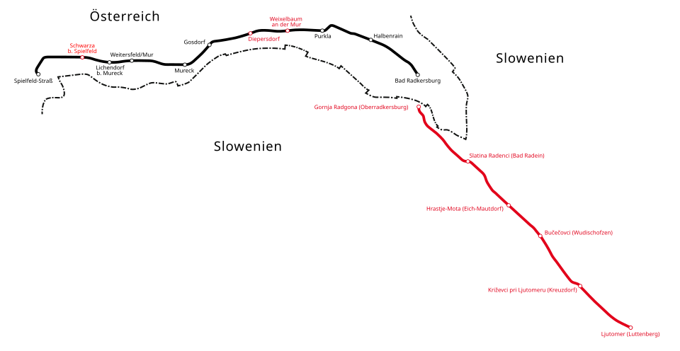 - ↑ Verena Gangl: Bad Radkersburg: Umstrittene Bahntrasse nach Slowenien: Gespräche für eine Lösung aufgenommen. 23. Februar 2022, abgerufen am 8. April 2022.