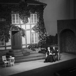 | Bühne mit zwei Personen, sitzend, vor einem Haus | SAPA Foundation : https://atom.sapa.swiss/a-1553-fo-66 | Fred Erismann | Datei:SAPA-A-1553-FO-66-2-DC.tif |