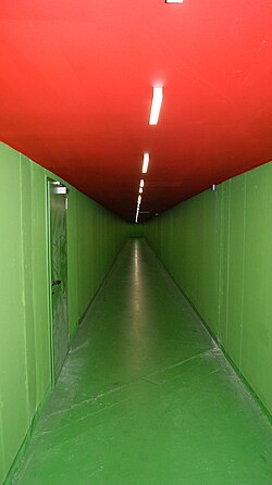 Eine unterirdisch geführte Anbindung führt durch den seit den 1970er-Jahren bestehenden, nun neu gestalteten Verbindungsgang, zum nordöstlichen Teil.[28] Diese Unterführung ist sehr dominant mit mehreren Videoüberwachungskameras in Dome-Ausführung ausgestattet.