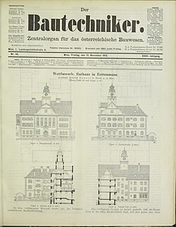 Anfangs kamen die Pläne von Heinrich Dauner, wurden jedoch später verworfen und als Architekt wurde der Wiener Josef Hofbauer (1875–1936) beauftragt. Das Rathaus war eines seiner ersten wichtigen Bauten. Gegenüber Dauners eher kleinteiligem, an Renaissance und Barock angelehntem Entwurf, zeichnet sich Hofbauers Konzept durch größere Klarheit und Monumentalität aus. Auch wenn in den Details die Anleihen beim Jugendstil der Wagner-Schule unverkennbar sind, steht vor allem die Hauptfassade stark in der Tradition neo-klassizistischen Bauens.
