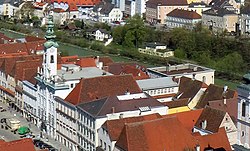 | Blick vom Turm der Steyrer Stadtpfarrkirche auf das Rathaus . | Diese Datei ist ein Ausschnitt aus einer anderen Datei | Fotografie: Bodipic Bearbeitung (Ausschnitt erstellt, gedreht, skaliert, Kontrast erhöht): Christoph Waghubinger ( Lewenstein ) | Datei:Rathaus Steyr vom Stadtpfarrturm 1.jpg | |