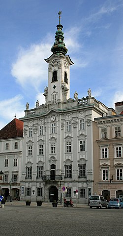 | Das Steyrer Rathaus am Stadtplatz 27 ist ein von 1765 bis 1778 errichtetes Rokokobauwerk nach Plänen Johann Gotthard Haybergers. Baumeister war Wolfgang Hueber. | Eigenes Werk | Schutz67 | Datei:Rathaus.Steyr.Rokoko.jpg | |